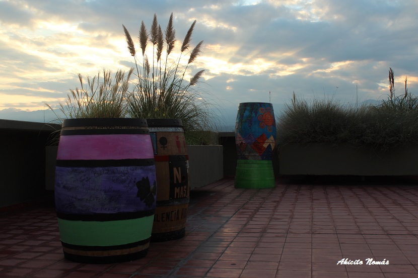 Una nota de color es que al salir al vestíbulo de la terraza te reciben las reinas de la vendimia: como todos saben, en Mendoza se festeja en marzo la Fiesta Nacional de la Vendimia, donde cada departamento postula una representante de entre las cuales se elegirá a la reina. Los retratos de cada una de ellas están allí y es lo primero que ves. Lo segundo que notás, ya una vez afuera, son las esculturas y los barriles pintados con diferentes motivos. Es que la municipalidad además cede ese espacio para distintas expresiones culturales, y en el momento en que la visitamos se había realizado una iniciativa que convocaba a artistas de todo el país para pintar barriles con una consigna: «Basta de violencia».