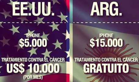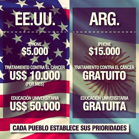 Pero esos no son los puntos por lo que tildo a la imagen de poco feliz. De hecho, son puntos en los que conceptualmente coincido plenamente. El problema está en la comparación que hace con el Iphone, que no tiene pies ni cabeza, y en la aseveración que deduce que como tenemos educación y salud gratis está bien que un celular salga el triple porque se trata sólo de una cuestión de prioridades. Una cosa no tiene nada que ver con la otra. En el barrio diríamos que están comparando peras con bananas. Yo digo que, además de incoherente, es una visión conformista: si pudiéramos tener celulares a precios decentes, además de salud y educación gratis, ¿por qué no ir por ello?