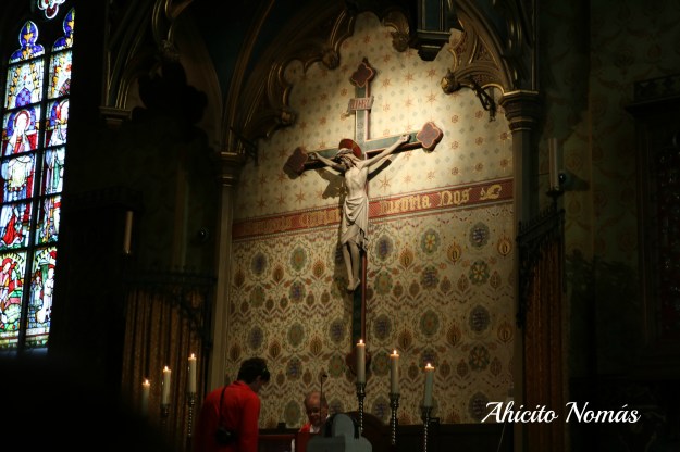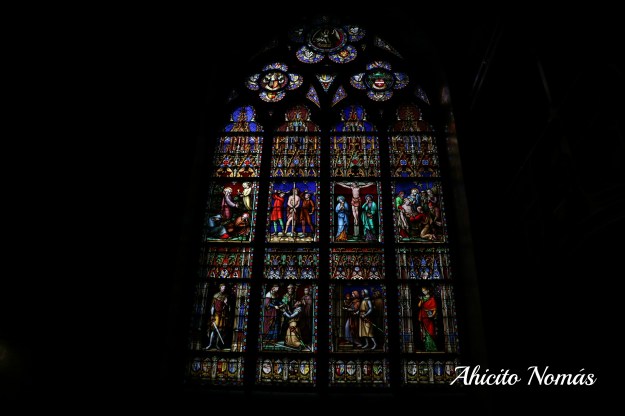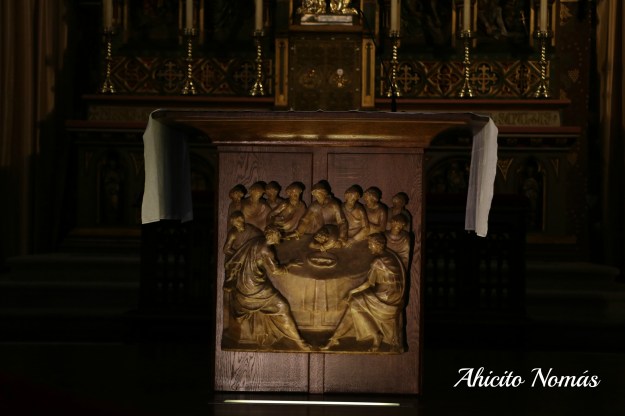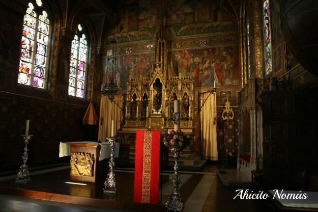 Claro que ya sabiendo de la restricción tampoco fui tan necio como para insistir, así que me alejé cámara en mano para fotografiar otras áreas de la tan pequeña como impactante basílica, como el cargado altar principal, detrás del cual se encuentran los murales que retratan a Teodorico recibiendo la Santísima Sangre en Jerusalén, y el momento en el que él mismo junto a su esposa la entregan al capellán de Brujas.