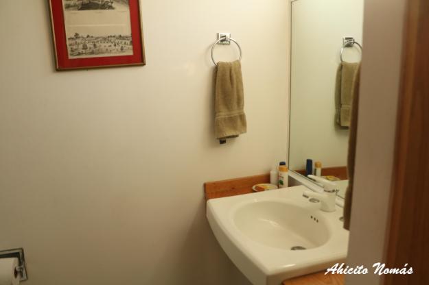 El baño es en suite, y aunque pequeño es lo suficientemente cómodo para manejarse sin andar golpeándose. También está equipado con shampoo, jabón líquido y varias toallas guardadas en el armario, así que tampoco de esto habrá que preocuparse.
