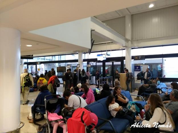 En el Nuevo Pudahuel daba toda la sensación de que un vuelo se había cancelado, porque por todos lados alrededor del gate 7 por el que abordábamos había cantidad de gente durmiendo. Pasamos un rato allí ya que nuestra conexión estaba programada para las 8 de la mañana y el paso por los scanners de seguridad había sido muy rápido, así que luego de tomar algunas notas para estos posts y leer un poco, llegó el momento de comenzar el embarque que se realizó por plataforma, permitiéndome fotos como la de la portada.