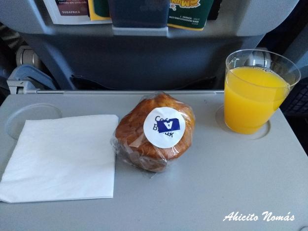 Habiendo dejado atrás la cordillera llegó el momento del servicio abordo, y acá es donde Latam muestra la pobreza en la que viene inmersa desde hace algún tiempo, al menos a compararlo con otros tiempos. El muffin es gigante, pero de mala calidad: apelmazado y sin gusto a nada. Lo probé y lo dejé por la mitad, contentándome únicamente con el jugo de naranja.