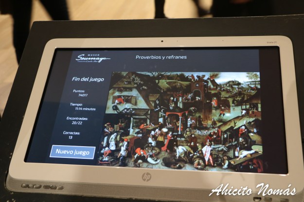 Una particularidad de estas salas que me entretuvo un buen rato fue el juego interactivo basado en el cuadro «Los Proverbios Flamencos» de Pieter Brueghel. Así, frente al cuadro mismo, hay una pantalla que muestra su imagen también, y en el que van apareciendo uno a uno el texto de 22 de los proverbios representados en la obra. El juego consiste en interpretar el refrán y buscarlo en la pintura, marcándolo en la pantalla táctil. Asimismo, hay que indicar el significado correcto. Nuestro resultado: Ubicamos 20, pero sólo acertamos en la explicación de 13 de ellos.