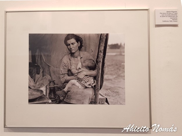 Su fotografía más famosa la tomó cuando el estado la contrató junto a un grupo de otros prestigiosos fotógrafos para realizar un relevamiento en imágenes de la situación de la población rural norteamericana. Gran parte de la muestra gira en torno a su trabajo encargado por la Farm Security Administration, e incluye por supuesto la serie Madre Migrante, fotos tomadas a Florence Thompson y sus hijos, en el momento en que estaban inmersos en la más profunda pobreza.