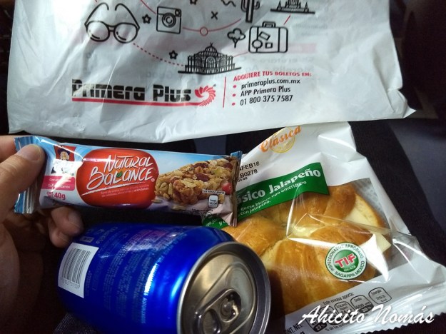La bolsita contiene un sandwich con jalapeño (agarrate con el picante) y una barrita de cereales. Suficiente para pasar las horas que nos esperan arriba del micro.