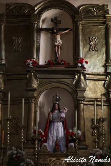 En el altar y el retablo se ven las reminiscencias cuzqueñas, con hermosas tallas en madera. La imagen de la Candelaria, en el centro del altar mayor, tiene pelo natural y una corona de plata. Para completar el retablo aparecen San Francisco, la Virgen del Valle y San Pedro Nolasco, patrono de la iglesia.