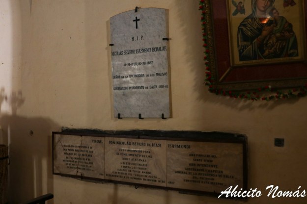 De hecho en el interior de la iglesia, empotrado en una de sus paredes, se encuentra la tumba con el cuerpo momificado de este personaje central en la historia de Molinos, que nacido en la hacienda familiar ubicada justo en frente a la parroquia, murió en ese mismo lugar en 1837. Una placa lo recuerda como «Señor de la Encomienda de los Molinos y Gobernador Intendente de Salta 1809-10».