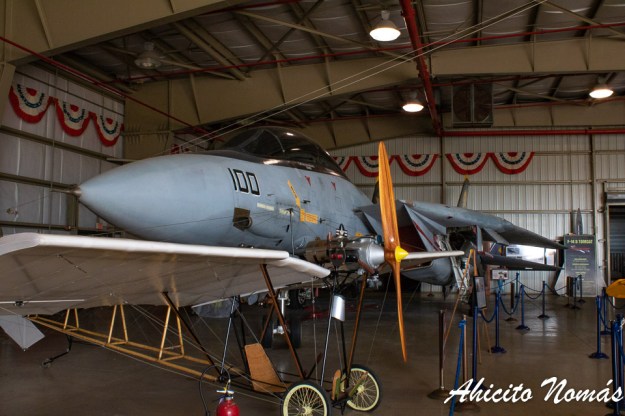 La estrella del museo es una muestra de los que les digo. Se trata del hermoso y enorme F-14D Tomcat que con orgullo el Wings over Miami mantiene bajo su techo. Por lejos el avión más moderno y grande que tendremos oportunidad de observar aca (y a este sí que lo tenemos bien cerquita), pero entre su tamaño y la falta de espacio en el hangar sacarle una foto exclusiva es un absoluto imposible. Es por eso que en la que elegí sale con la otra joyita del museo: una réplica del Demoiselle construido en París por Alberto Santos-Dumont.