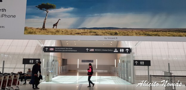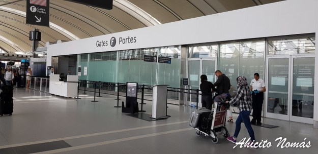Allí dentro se hace el control de seguridad (laptops fuera del equipaje de mano y en una bandeja exclusiva) y se pasa a un enorme hall donde se realiza migraciones, pero no de salida de Canadá, sino de ingreso a Estados Unidos. Tal como es cuando se llega a un aeropuerto estadounidense, el primer paso es pasar por las máquinas que escanean la documentación y huella digital, nos sacan la foto y donde debemos contestar el cuestionario de rigor. Luego se pasa a la entrevista con el agente de la TSA.