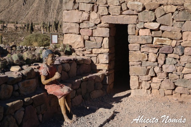Algo desde mi punto de vista innecesario es la estatua apostada en la entrada de una de las viviendas, simulando una mujer indígena sentada al aire libre. Por supuesto que sirve para ilustrar cómo era la fisonomía de los habitantes del Pucará en su momento, cómo se vestían y hasta quizá ayudar a imaginar sus costumbres y quehaceres diarios, pero en mi opinión algo tan claramente plantado le quita algo de legitimidad al resto del lugar. Alguna ilustración con una explicación escrita en algún cartel habría resuelto mejor la necesidad de informar, si es que eso es lo que se buscó con esta escultura.
