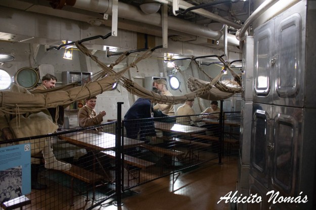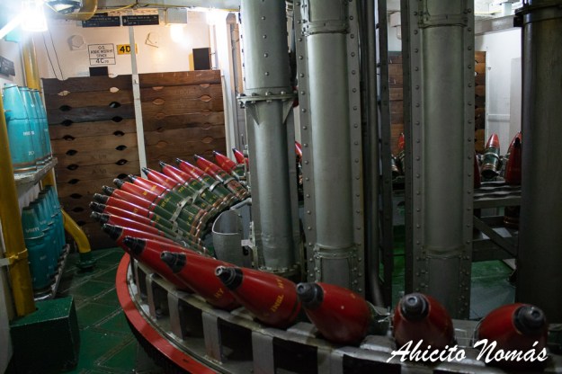 Párrafo aparte se merece la sala de municiones, seguramente la parte más emocionante de toda la visita porque, tratándose de un buque de guerra podríamos decir que es como su corazón, y además por supuesto es siempre el lugar más inaccesible al que se pueda aspirar. Y sí, en el HMS Belfast uno puede meterse allí y caminar entre réplicas de bombas (es decir, espero que fueran réplicas). Uno casi se siente un marinero de verdad, porque llegar hasta ahí es bajar y bajar por escalerillas y escotillas cada vez más angostas hasta desembocar en un cuarto donde el espacio para moverse es casi nulo.