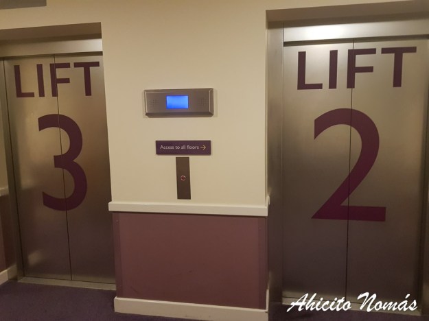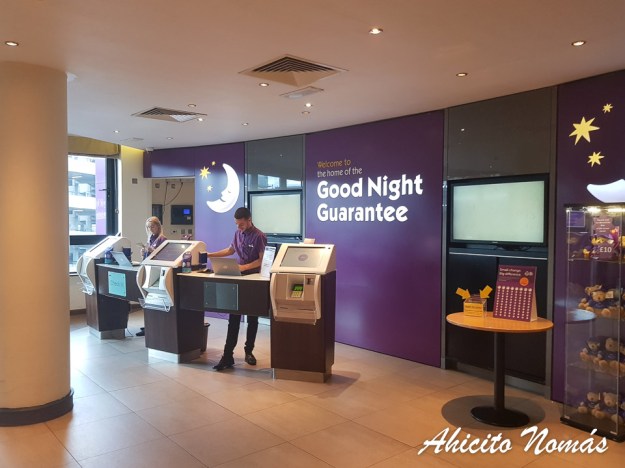 Del Premier Inn les puedo decir entonces que está ubicado en la Terminal Norte del aeropuerto, y que siguiendo la cartelería se puede llegar fácilmente caminando. Es muy moderno, al punto de dar un poquito de miedo: al entrar uno se encuentra con un hall totalmente vacío, a excepción de los ascensores que hay que tomar para llegar al primer piso donde está la recepción en la que únicamente hay máquinas de autogestión.