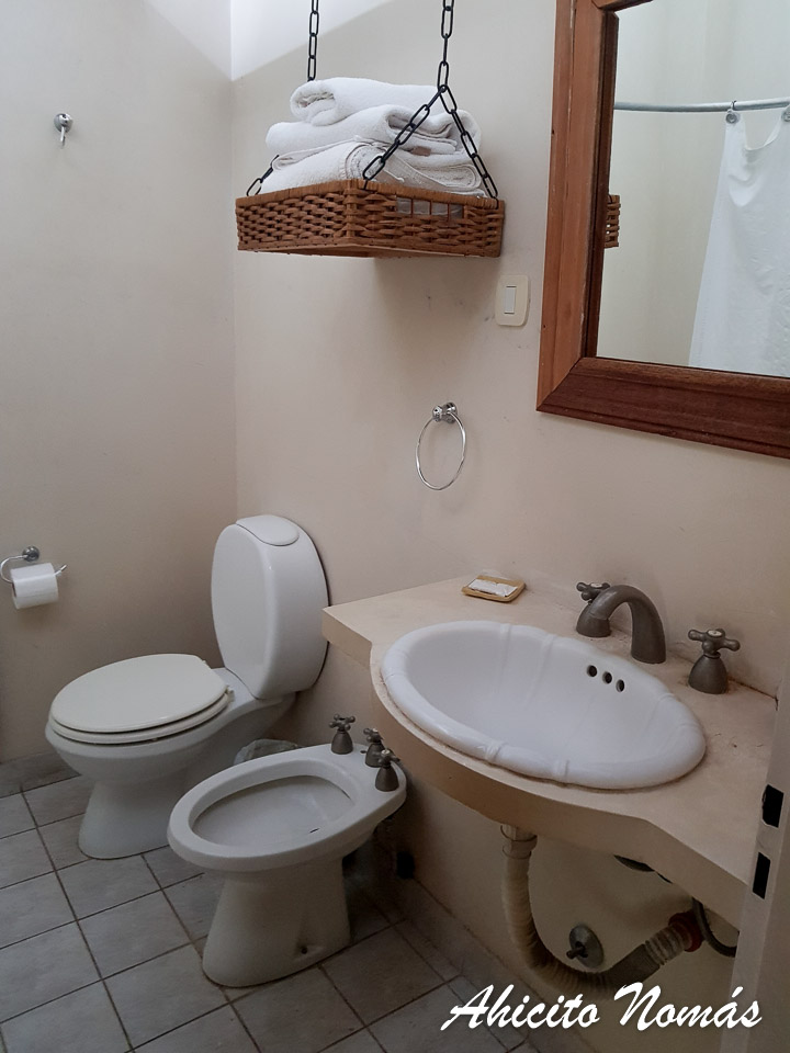 Detrás de la cama (que hay que decirlo, era super cómoda y amplia), y en un pequeño desnivel de 2 escalones, está el placard empotrado y, en el extremo, una tabla de madera que funciona como escritorio. Hacia el otro lado, el baño, cómodo también y equipado con bañera (fundamental para bañar al bebé) y, detalle no menor para el invierno, con calefacción.