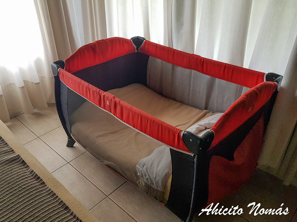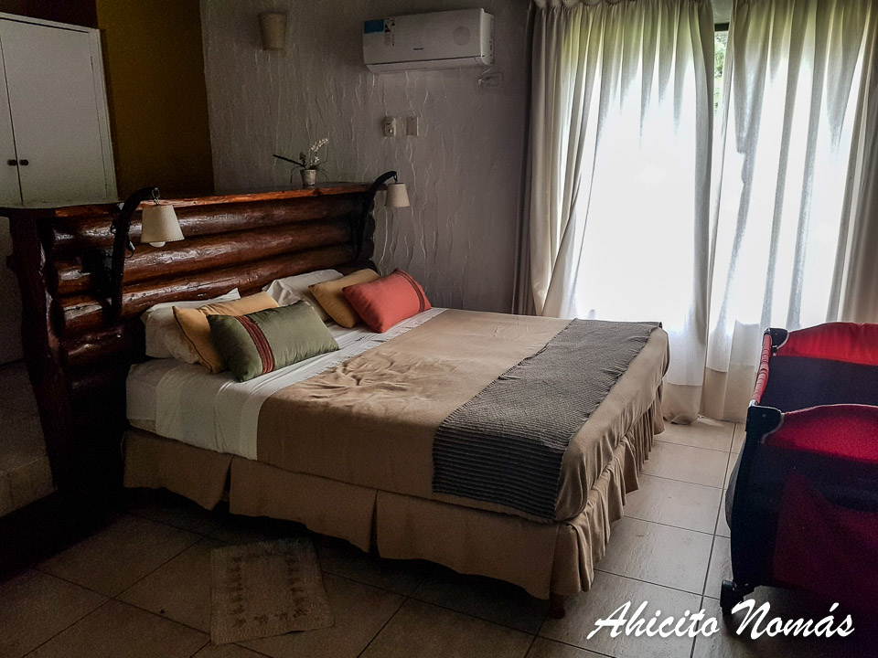 Al nivel de la cama la habitación está equipada con una amplia mesa baja, algunos puffs, una pequeña heladera, TV, y, por supuesto, la practicuna que habíamos pedido especialmente al momento de hacer la reserva. La calefacción es con al aire acondicionado frío / calor y un caloventor eléctrico empotrado, que sinceramente a mi me generaba algunas dudas al reservar, pero que la verdad funcionó muy bien. Más considerando que el fin de semana que fuimos fue de lluvia y frío.