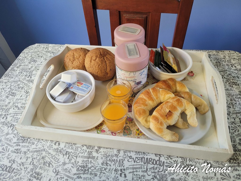 Otro punto fuerte es el desayuno, que cada mañana tiene algunas pequeñas variantes. Es un desayuno seco (el café e infusiones las preparás vos mismo en la cabaña) servido en una bandeja que contiene panes (cada día un tipo de pan diferente) y alguna factura o torta. El jugo de naranja que ves en la foto es exprimido de verdad. Se sirve desde las 8 de la mañana y no hay horario de cierre, así que cuando te despertás avisás y te lo alcanzan.