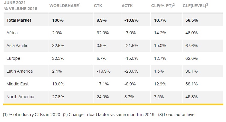 El cuadro comparativo Junio-21 / Junio-19 fue publicado por IATA en el boletín de prensa del 28/07/21