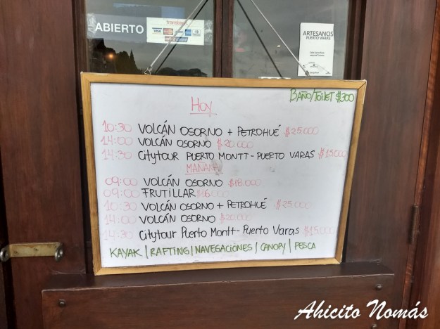 Durante la época de vacaciones de verano Puerto Varas se llena de gente, siendo uno de los centros turísticos más importantes de esta zona de Chile, y con un sin fin de actividades para realizar, desde deportes acuáticos en el lago, hasta caminatas por el volcán, pasando por supuesto por recorrer el centro del pueblo con su muy linda arquitectura basada en madera. Pero los valientes no le temen al frío y realizan alguna de estas actividades en otoño también, como parece desprenderse de este letrero en la oficina de turismo. Eso sí, fíjense bien el horario y cuídense de la inflación!