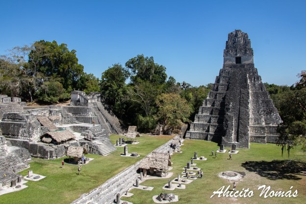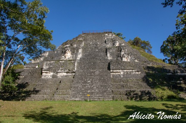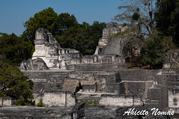 Iniciamos la caminata en el Centro de Visitantes desde donde nos dirigimos hacia la Gran Plaza, el corazón de la ciudad y punto en el que se levantan sus edificios más relevantes. Allí se encuentra el Templo del Gran Jaguar, que con sus 45 metros de altura está orientado hacia el oeste, de cara a la puesta del sol. Al frente, en el extremo opuesto de la plaza, se levanta el Templo II, también conocido como Templo de las Máscaras, construido cerca del año 700 por el gobernante Jasaw Chan K’awiil I, como monumento mortuorio para su esposa. A este templo se puede subir por una escalera instalada en su parte posterior para obtener una espectacular vista aérea de la Gran Plaza.