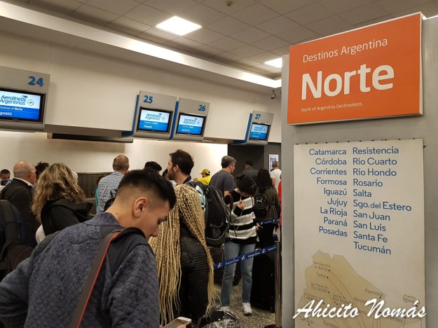 Llegamos a Aeroparque a las 4:25, que es casi el tiempo con el que suelo llegar cuando no viajo por el día, sin equipaje. En el check in de «Destinos Norte» había bastante gente, pero por suerte corría bien, y estuvimos a tiempo.