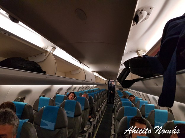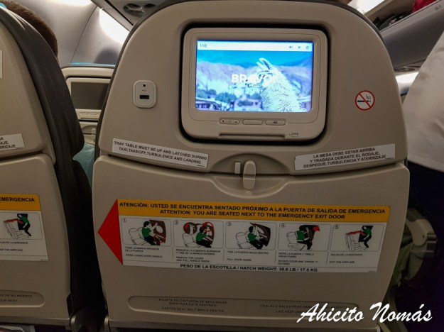 La gran virtud del E-190, a mi entender, es la comodidad para el pasajero. Con sus asientos anchos y mullidos en configuración 2-2 se convierte en un avión realmente confortable, y el pasajero no se siente tan apretado como normalmente pasa en la clase turista de los fuselajes angostos. A pesar de haber elegido otro asiento, en esta ocasión nos asignaron las salidas de emergencia, así que dispusimos de algo de espacio extra para las piernas, y por supuesto recibimos la charla de la TCA con instrucciones específicas, las cuales igualmente están convenientemente pegadas en la mesa rebatible.
