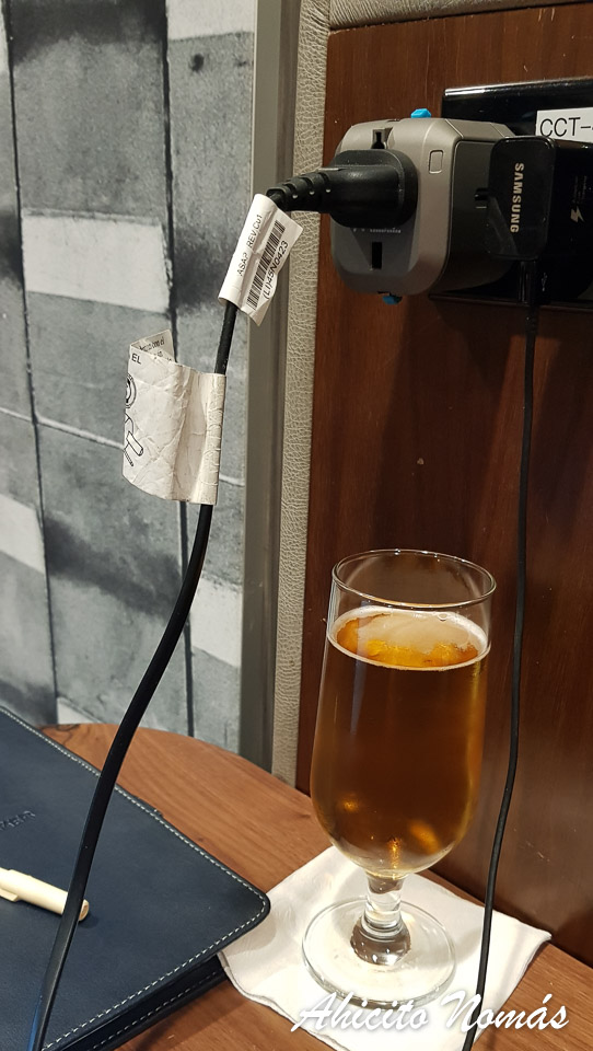 El cuarto en sí era pequeño, pero cómodo. Para pasar una noche a la espera del vuelo de conexión está más que bien. Casi no hay espacio para guardar ropa, pero se entiende ya que aquí todo el mundo está de paso y nadie va a desarmar la valija y esparcir sus cosas por el mobiliario. Con un par de estantes y perchas disponibles es suficiente. Lo que sí hay en abundancia son toma corrientes, y la verdad que se agradece, porque cuando uno viaja por trabajo vive conectado, tanto por razones laborales como para estar comunicado con la familia. El pequeño escritorio estaba lleno de tomas y además había uno más en la mesita de luz que tiene la particularidad de ser extremadamente liviana por lo que uno puede trasladarla a cualquier punto de la habitación.