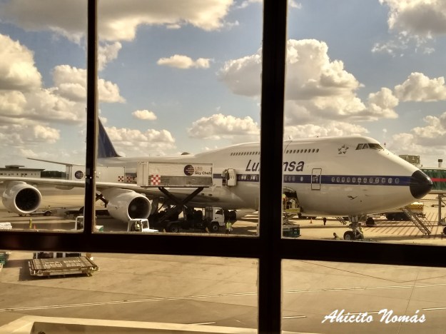 Ya en zona de preembarque compramos unos jugos de naranja con medialunas a modo de desayuno, revisando por supuesto el precio previamente para no ser sorprendidos con una cuenta usurera. Mientras nos encaminábamos hacia el gate correspondiente me dediqué a sacarle fotos a los aviones en plataforma, y por supuesto la espléndida Reina de Lufthansa tuvo su retrato en la versión livery retro que tanto me gusta.