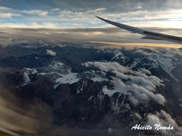 El capitán anunció el cruce de cordillera unos doce minutos antes de comenzarlo, para darle tiempo a todos de ir al baño y volver a sentarse con los cinturones abrochados. Por mi lado me dio tiempo de preparar el celular para captar uno de los más bellos paisajes que puedan ver los ojos humanos: los Andes nevados desde el cielo.