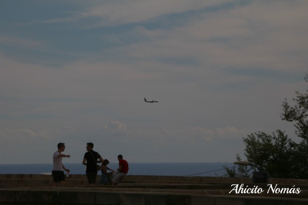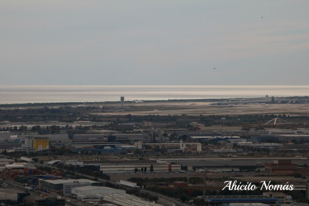 Es habitual ver pasar aviones a baja altura muy cerca del castillo. Es que muy cerca del mismo se encuentra el Aeropuerto Internacional de Barcelona, y las aeronaves pasan por allí en final corta para aterrizar. Un poco de zoom, y así vemos las pistas desde la terraza del Montjuïc.