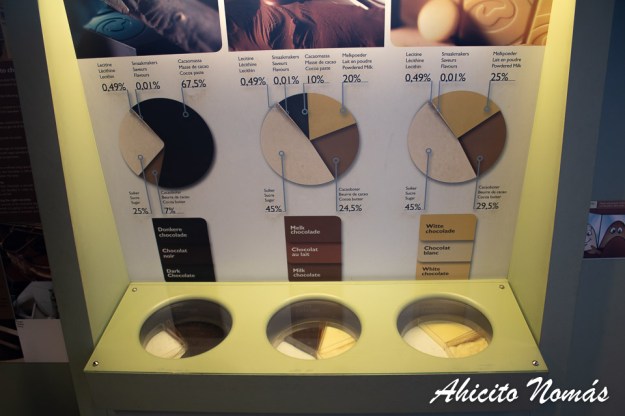 Pero la muestra del museo no es sólo histórica sino que se sumerge también en cómo se produce el chocolate. Es normal escuchar que el chocolate negro es el más sano, mientras que el chocolate blanco no es chocolate, pero en Brujas queda bien claro por qué. Tan sólo hay que mirar en detalle este panel que muestra los diferentes porcentajes de cada ingrediente, en cada variedad de chocolate. Vean nomás los niveles de azúcar, y cómo la pasta de cacao es nula en el chocolate blanco.
