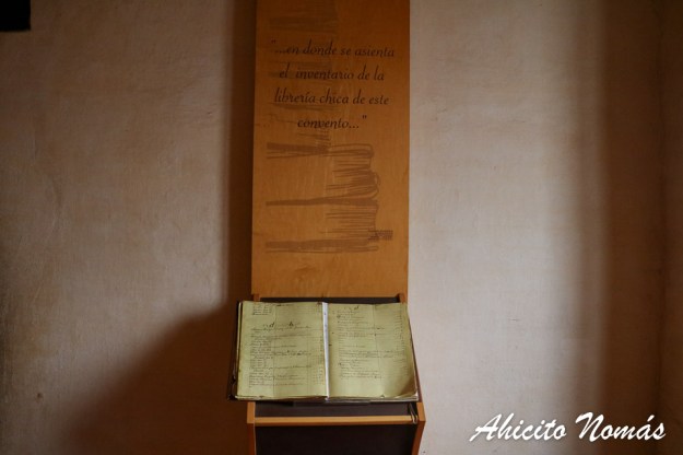 Lo que sí me hizo agua la boca fue el inventario de la Segunda Librería del convento, expuesta en un cuaderno abierto cuyas páginas registran en letra manuscrita los diferentes libros que había en existencia.